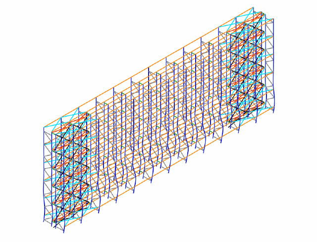 单排货架垂直拉杆(黑色)+横梁间水平拉杆(青色)+横梁与垂直拉杆间水平拉杆(红色),屈曲系数17.042:货架的屈曲模态为层间屈曲变形,屈曲系数明显提升,达到无侧移结构要求,垂直拉杆有效。