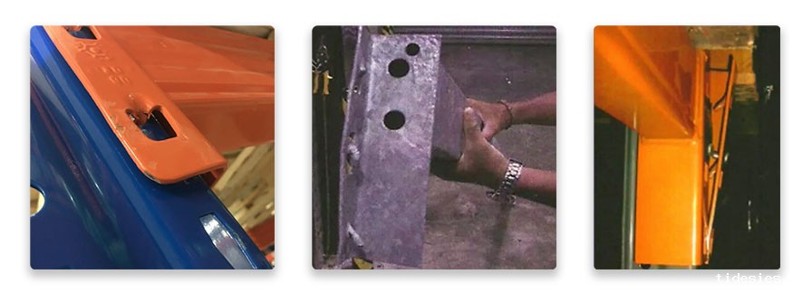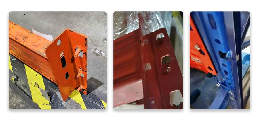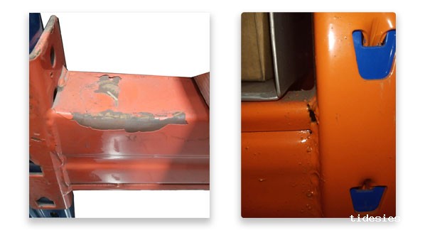 我们遇到的因挂齿断裂触发的横梁坍塌事故,挂齿均为图中所示的鹰爪式挂齿。对此需要特别明确:这不代表着该类型对应的货架产品一定存在质量缺陷,只要材料冷弯性能、加工工艺达到一定要求,挂齿是不会出现问题的,这一点也在我们检测的诸家同样是鹰爪式挂齿的货架产品中得到了验证。那么能否通过检测预防此类事故呢?现实是不能。即使通过各种探伤技术检测了挂齿根部的裂纹,目前也没有定量标准判定挂齿是否安全。在新的标准制订之前,只能建议定期巡检,一旦发生事故并确定是挂齿缺陷导致,应立即针对整批次横梁采取措施,包括但不限于加固、降载、报废。