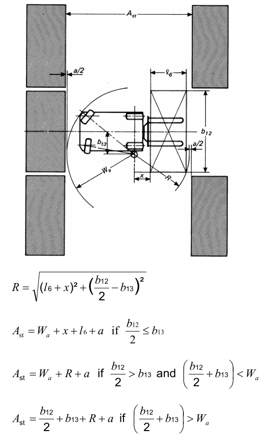 欧洲行业标准FEM 4.005(E),规定了几种主流类型的工业叉车进行90°堆垛时,对巷道宽度的要求。