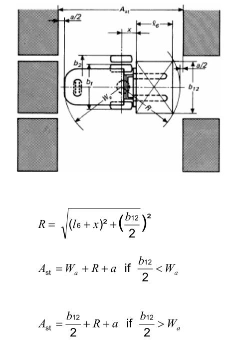 二、其次确定叉车操作容差a(见上面各图所示),一般为200mm。当存储单元尺寸异常导致操作与堆垛困难、生产率要求或叉车驾驶员技能水平变化时,应适当增大a的值。