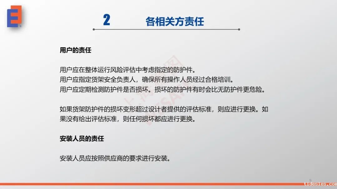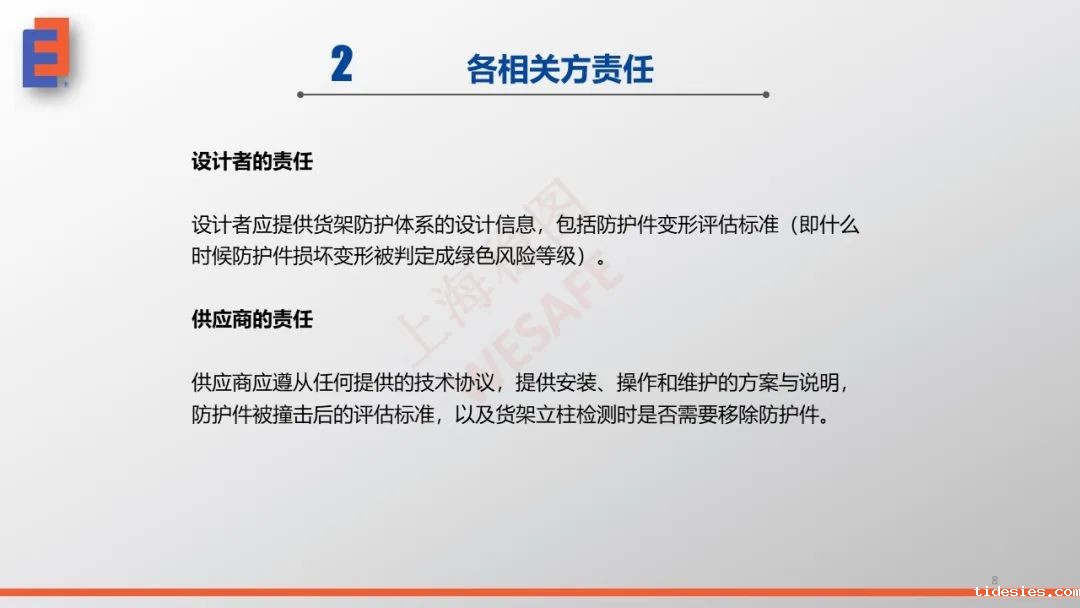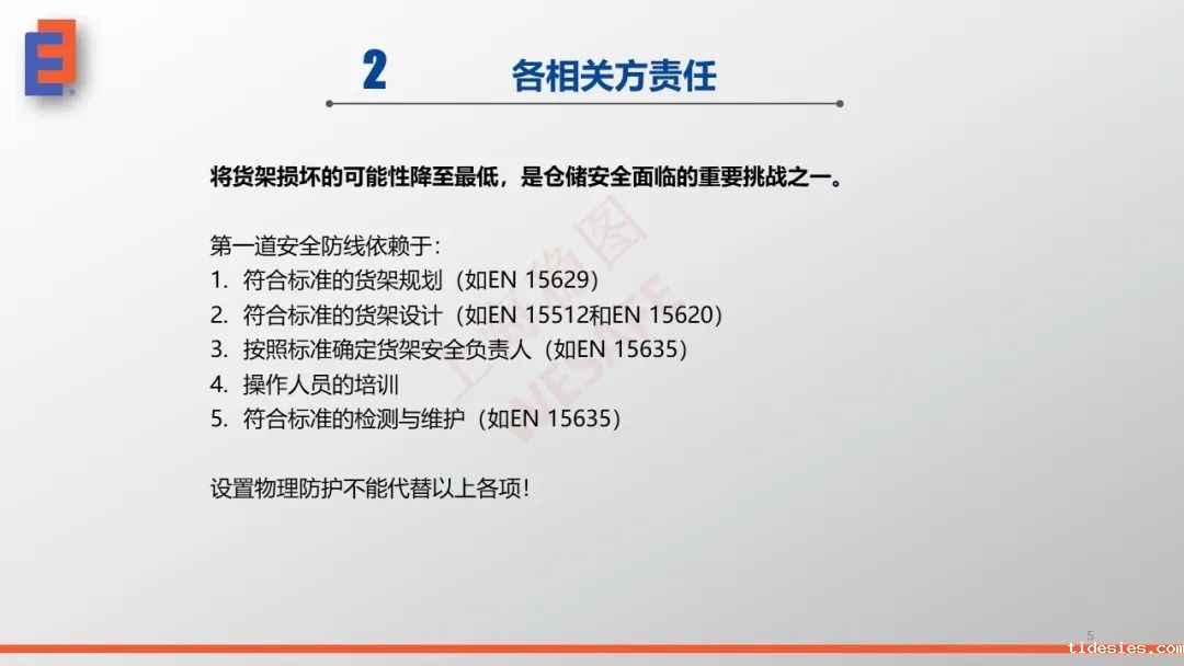 符合标准的货架规划(如EN 15629)、符合标准的货架设计(如EN 15512和EN 15620)、按照标准确定货架安全负责人(如EN 15635)、叉车操作人员的培训、符合标准的检测与维护(如EN 15635)。设置物理防护属于第二道防线,它并不能代替第一道防线中的任何一项!
